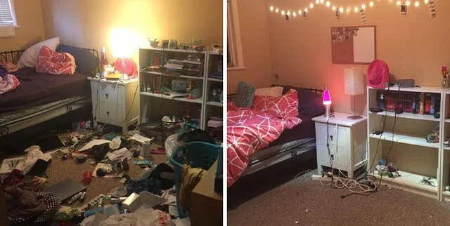 A room that is a total mess — clothes everywhere, bed unmade, last night’s dinner still on the floor — is an indicator that the inhabitant of the room is suffering severe depression. In this state, with its accompanying feelings of exhaustion and lack of purpose, they feel unable to lift a finger to do something about it. And yet if it was possible for them to clean up the room they would feel much better.