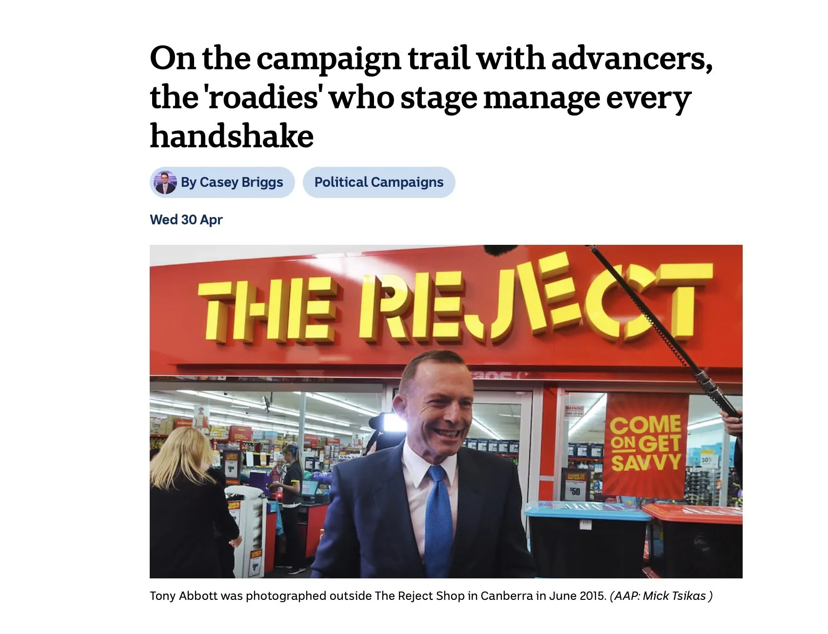 A contributor helpfully pointed out advancer. This is the person who goes ahead of the main caravan of the approaching politician and susses out who to speak to, who is likely to shake hands, which babies will smile and not cry, which parents won’t be aggressive on the current state of childcare, which elderly people won’t snap about the state of aged care, which working couple won’t arc up about housing, and which koala won’t pee on the politician. Where to get a coffee or a beer or an onion or a ride in a tractor. The advancer sorts all of this out so that by the time the politician arrives the path is smooth. You do not want your candidate putting a hand out to be shaken only to have it rebuffed. If your job is to advance, then you make sure that doesn’t happen.